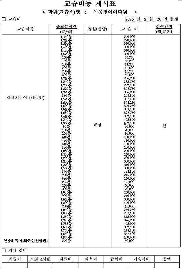 독쫑영어 상인1 교습비등 게시표
